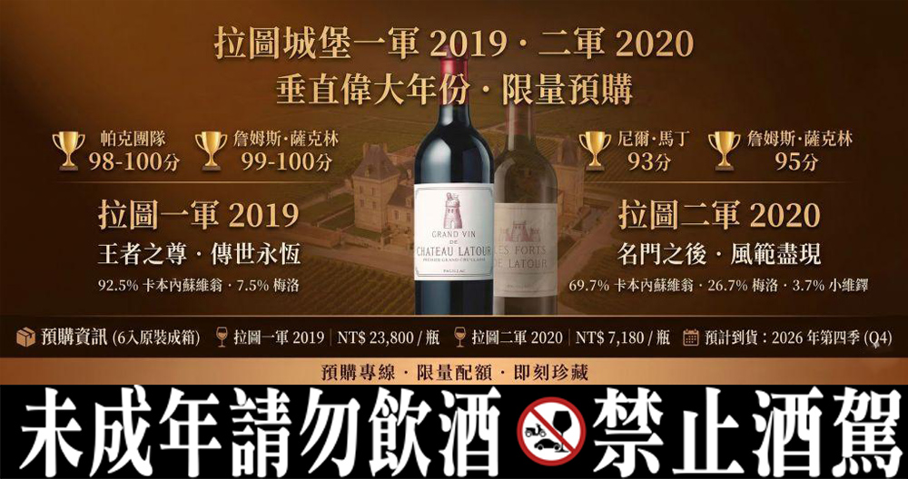 | 拉圖一軍 | 2019 | 92.5% 卡本內蘇維翁、7.5% 梅洛 | RP 98-100 / JS 99-100 | NT$ 23,800 / 瓶 |