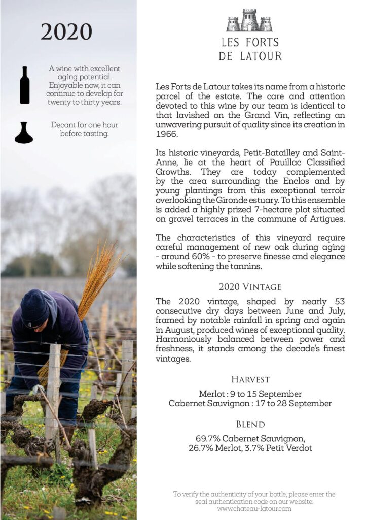「拉圖二軍」(Les Forts de Latour)的名字,源自莊園內一塊歷史悠久的地塊。自1966年創立以來,它始終以一軍相同的呵護與專注釀造,品質絲毫不讓。其葡萄精選自波雅克(Pauillac)頂級產區,包括著名的小巴塔耶(Petit-Batailley)、聖安娜(Saint-Anne),以及環繞「l’Enclos」的風土與年輕葡萄藤。2020年份在近乎53日的連續乾旱與關鍵降雨的交織下,塑造出同時兼具力道與新鮮感的卓越酒質。它完美繼承了拉圖的骨架與氣韻,是品味名莊風範最動人的起點。
