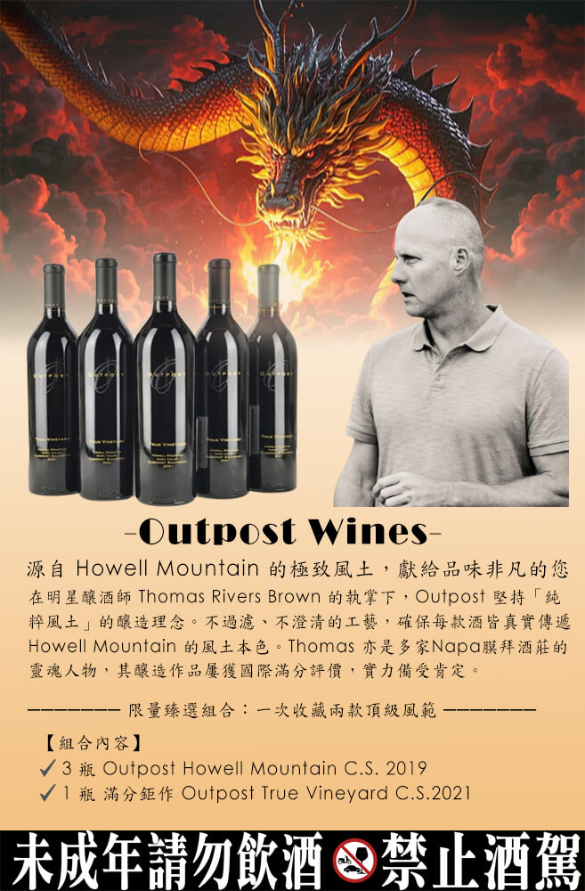 【組合內容】 ✔️ 3 瓶 Outpost Howell Mountain Cabernet Sauvignon 2019 ✔️ 1 瓶 滿分鉅作 Outpost True Vineyard Cabernet Sauvignon 2021 ✨ 整組專屬價:$29,000 ✨