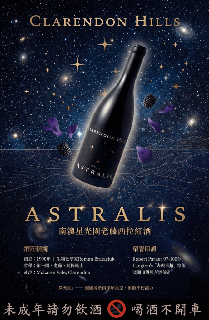 What stands before you is not merely a bottle of wine, but a South Australian legend sealed in starlight. Hailing from Clarendon Hills—lauded as one of the “World’s Greatest Estates”—the Astralis is the pinnacle of founder Roman Bratasiuk’s winemaking philosophy. It is a masterpiece that Robert Parker himself places on the same pedestal as the premier Grand Crus of Burgundy.