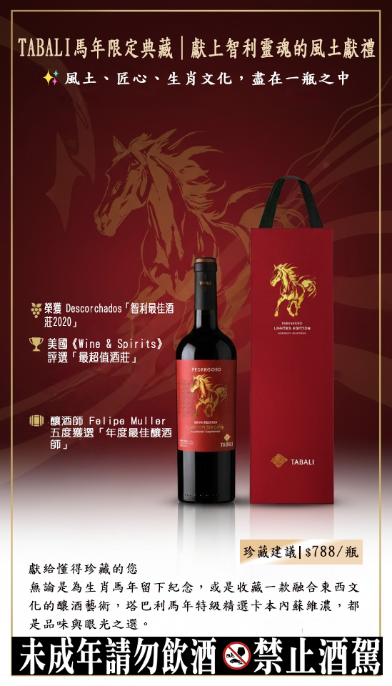 無論是為生肖馬年留下紀念,或是收藏一款融合東西文化的釀酒藝術,塔巴利馬年特級精選卡本內蘇維濃,都是品味與眼光之選。