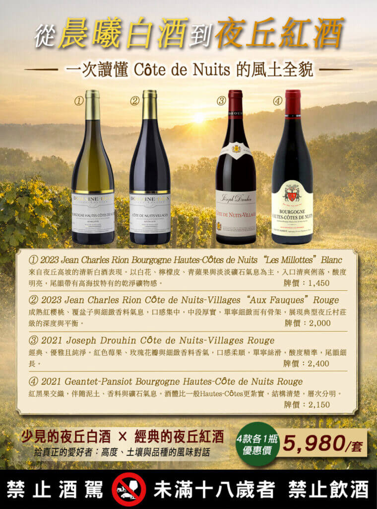 當我們談論勃艮第的夜丘(Côte de Nuits),大多數人首先想到的總是醇厚深邃的紅酒。但其實,這片風土同樣能孕育出令人驚豔的清新白酒。今天,我們透過四款精選佳釀,帶您展開一場從白酒到紅酒的風味之旅,感受高度、土壤與品種之間的對話。