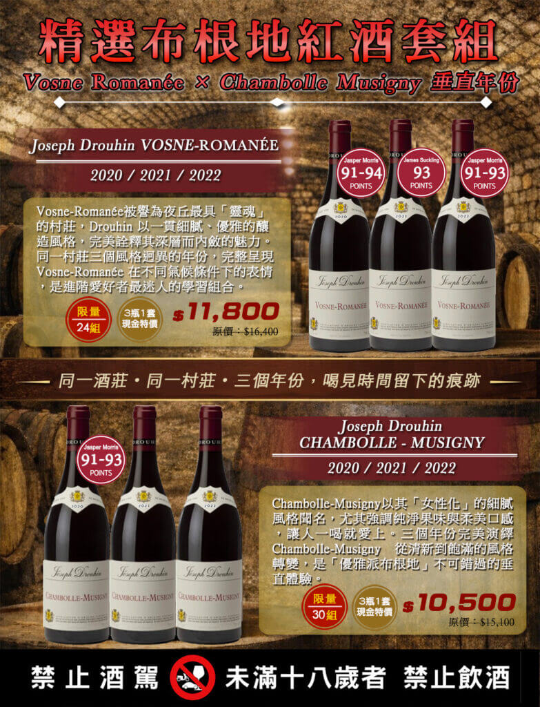 ③ 2021 Joseph Drouhin Côte de Nuits-Villages Rouge 經典、優雅且純淨的代表作。散發紅色莓果、玫瑰花瓣與細緻香料香氣,口感柔順,單寧如絲般滑順,酸度精緻,尾韻悠長,是理解夜丘風土的絕佳入門。 牌價:2,400元